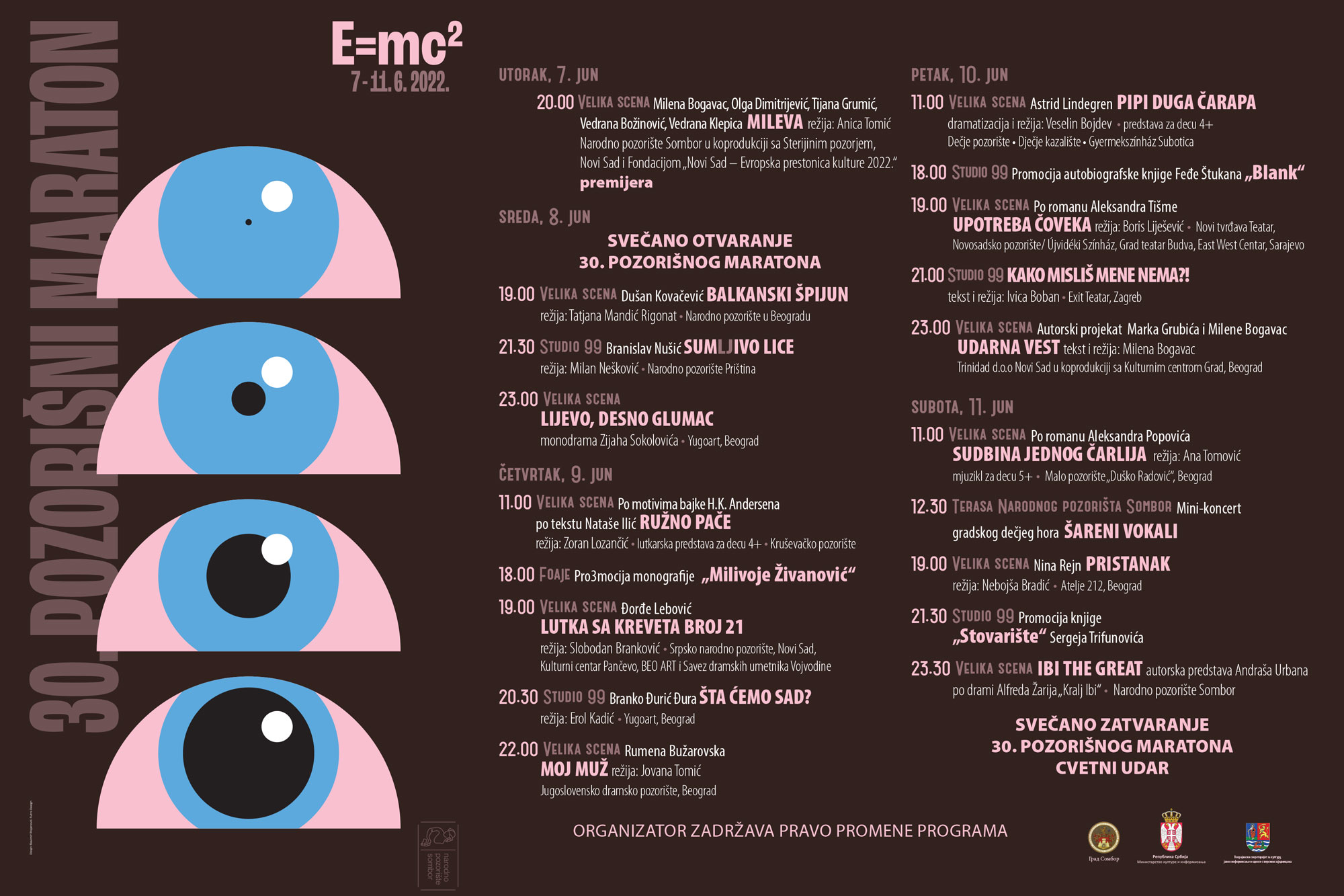 У четвртак, 9. јуна, у 11 часова, на Великој сцени биће изведена представа „Ружно паче“, рађена по мотивима бајке Х. К. Андерсена и тексту Наташе Илић, а у режији Зорана Лозанчића и извођењу Крушевачког позоришта. Од 18 часова ће у фоајеу Народног позоришта бити организована промоција монографије „Миливоје Живановић“. Од 19 часова ће на Великој сцени бити изведена представа „Лутка са кревета број 21“ Ђорђа Лебовића, у режији Слободана Бранковића и извођењу Српског народног позоришта Нови Сад, Културног центра Панчево, БЕО АРТ-а и Савеза драмских уметника Војводине. Од 20.30 у Студију 99 ће Бранко Ђурић Ђура извести монодраму „Шта ћемо сад?“, у режији Ерола Кадића, а испред Yугоарта Београд. Од 22 часа, на Великој сцени биће одиграна представа „Мој муж“ Румене Бужаровске, у режији Јоване Томић и извођењу Југословенског драмског позоришта Београд.