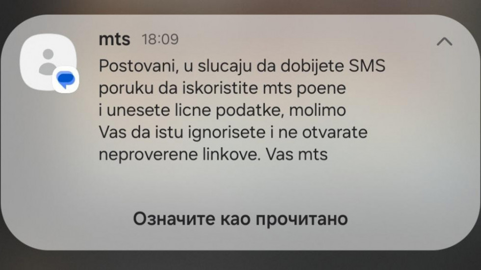 „Поштовани, у случају да добијете СМС поруку да искористите МТС поене и унесете личне податке, молимо Вас да исту игноришете и не отварате непроверене линкове“ стоји у поруци МТС-а која је послата свим корисницима.